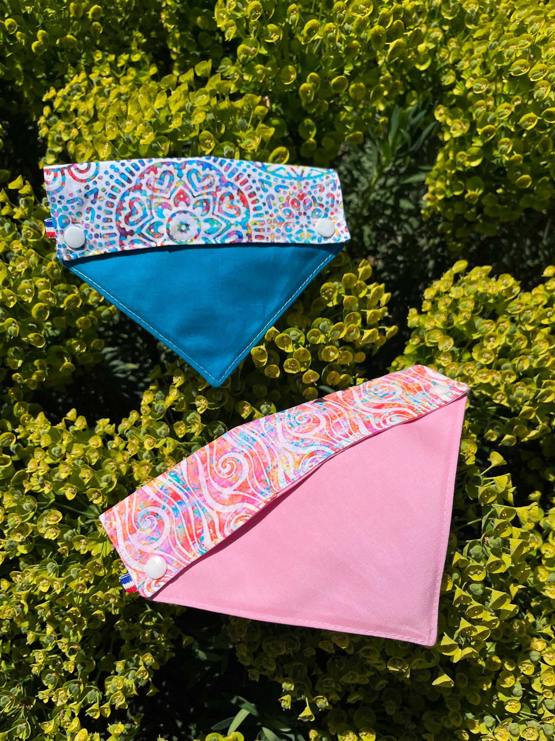 The bandana can be customized to your liking with the colours of your choice and is made from fabric in different colours. It attaches to your dog's collar with snap fasteners.